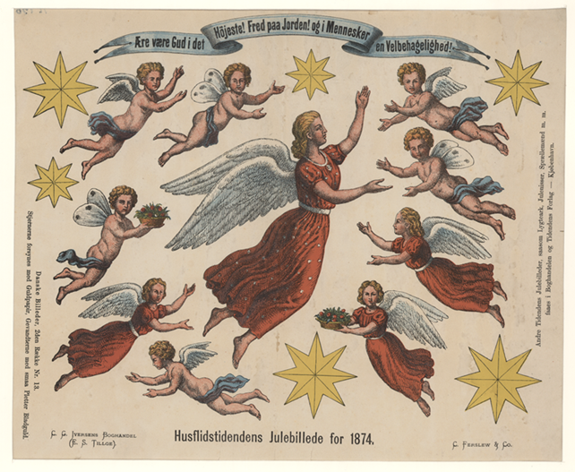 Hvordan kom man i julestemning for 150 år siden? Det ses af Husflidstidendens julebillede fra 1874. Stjernerne er forsynet med guldpapir og englenes gevandter med små pletter af bladguld. |